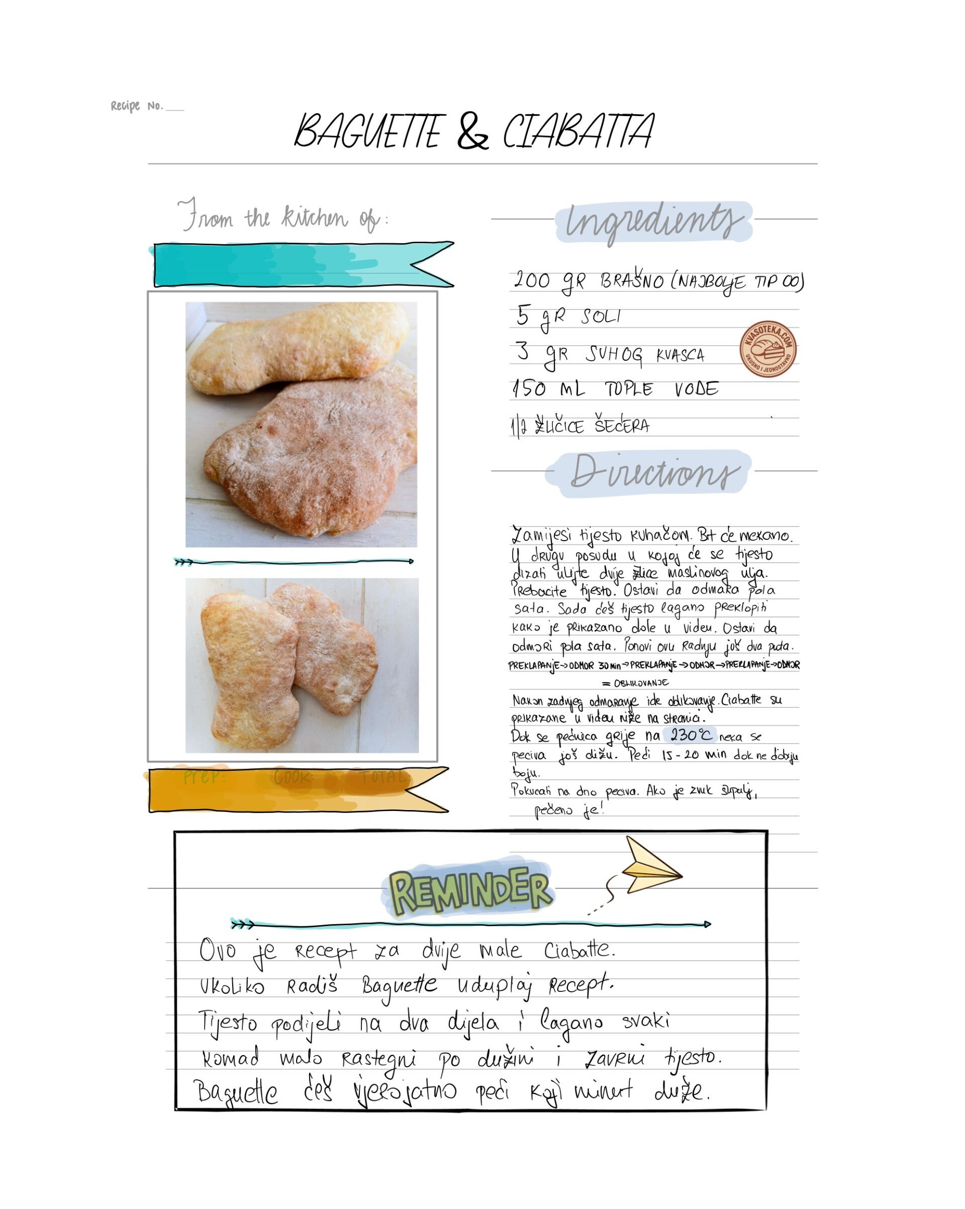 Ovo je recept za tijesto od kojeg možete napraviti Ciabatte i Baguette. A možete ga oblikovati i u normalnu štrucu kruha. Recept je za dva komada ciabatte, ukoliko radite baguette samo ćete tijesto oblikovati drukčije prije pečenja. I obavezno uduplati recept pa napraviti dvije štruce (svaka po 200 gr).